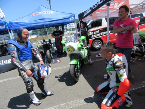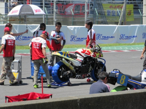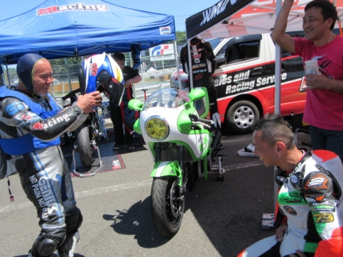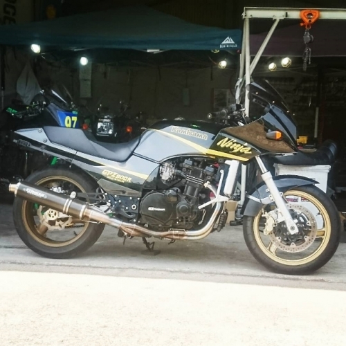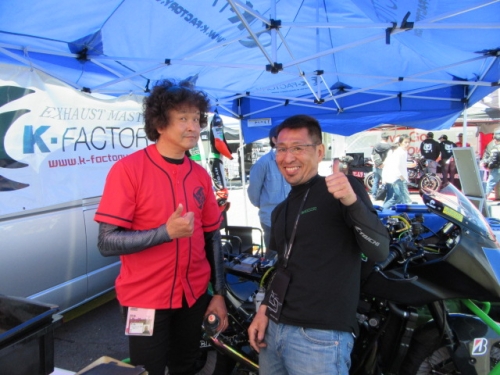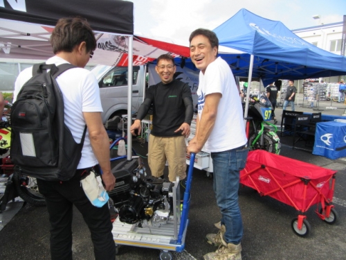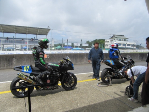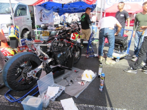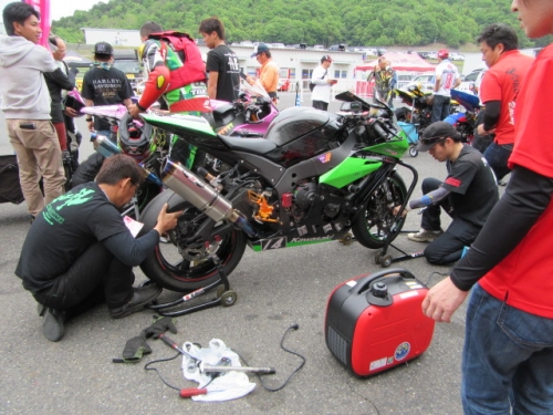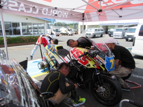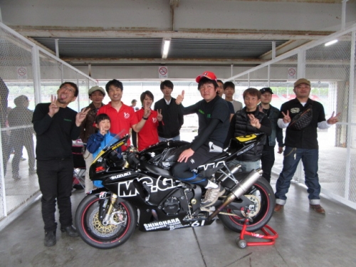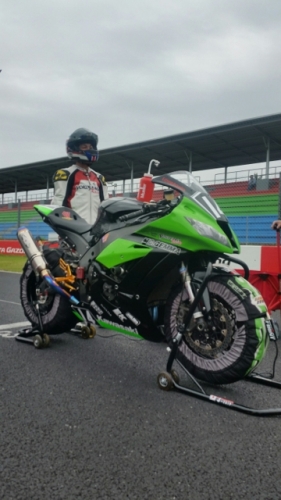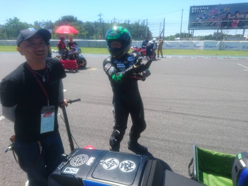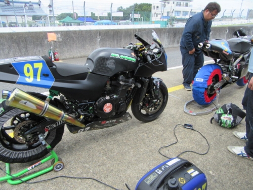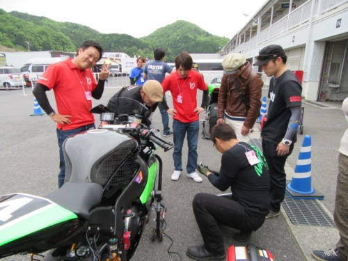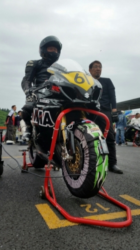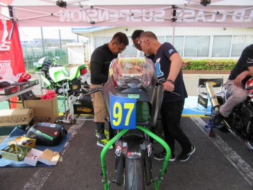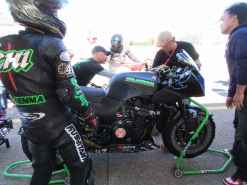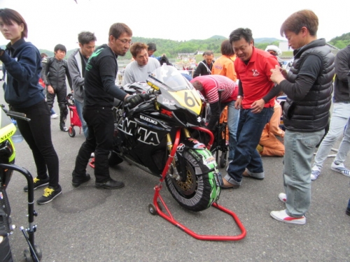 テイスト参戦記22018-05-19 at 21:59PM by 店長宿泊はいつもの、御老公の湯 温泉施設に宿泊施設のついた 快適な宿です^^ 手配はいつもアシダさん<m(__)m> 有り難うございます^^ 閉店まで飲んでる耐久レースです。 もちろん私も、アシダサンも退散します^^ 土曜日には ニッコリ土曜日の使者♪♪ シャラララ~シャララララ~と上田さん登場 こうなると 私もニンジャオタクっぷり発揮しなくちゃ(*^^)vと 勝手にテンションアップ^^ ニンジャマイスター上田さんの元 私もコケ太郎の名に 恥じない働きをしなければ(^_^;)(^_^;) キハモンさん^^大阪はキハモンです^^ 必死に復旧をお手伝いしているうちに 特スポ5分前 オイル飛散でディレイしてるので 復旧間に合うかな~と言う所で 着替えに入りました<m(__)m> 転倒厳禁で攻めよう 撒かれたオイルどれくらいかなーと チョッと不安になりつつ(^_^;) 心にプレッシャー^^ ハッキリ言って 今までに走ったサーキットで 最も苦手です。何か壁近いし 転がってる車両みんな土まみれ グリップ最高なんだけど、間合いが取れません(^_^;) 私勢いでタイム出してるので テクニック無いんです!(^^)! 1ヘアでスライド(+o+) もう、ダメです。ピットに戻って プロの様にタイヤ見ますが 無いも変わりは有りません(>_<)オイルでも付いてたら 気を取り直せるのですが もう一度走り出すも 恐怖心が払拭できません(>_<)。もう 帰ります。私、極度のビビりです^^ ダンディーはさっさと着替え 復旧ポジションで作業しました。 メカニックしてると 何て清々しい気分になれるんだろうと 現実逃避しながら・・・・・ 綺麗な女性やカスタム車両に目移りしまくり ターゲットはあのパイ乙^^ 分かってますよ、明日頑張ってクルーしたら・・・・ その3に続く テイスト オブ ツクバ 参戦記その12018-05-18 at 20:00PM by 店長3日間お休みいただいて 参戦して来ました テイスト オブ ツクバ SATUKI STAGE 全て突貫^^私らしいレース準備でした 出発2日前、とっても速いニンジャライダー^^ 上田さんのSPEED TECさんで ツクバAFセット^^をお願いして 35度の熱い室温の中、完璧なセットしていただきました(^^ゞ 特スポから、決勝まで 私の操作ミス以外では、一切のレスポンスロスも無く 大変走り易いセットアップ、有り難うございました。 一緒に食べに行った 地鶏のラーメン^^コレも絶品でした^^ ニンジャ屋にはどーもパイレーツ(サムライダ―知ってますか?^^) 感の多いショップが多い気がします^^ アレもコレも積んでるうちに スーパーロングも満載(^_^;) 大事なモノを忘れて、要らないものが多かった(+o+) 遠征の勉強になりました^^ 金曜日の特スポ初日です。 YSSサスペンションの販売元 PMCさんのテントに入れさせてもらって 準備始めます。緊張してたのですが いつも岡山で、ご一緒させて戴く顔ぶれで 少し気が楽になります^^ 新発売されるライディングレコーダー^^(ドラレコです^^) を装着して 抜かれ様を、後ろから前から録画しました^^ かなり鮮明で 言い訳が出来ません^^音声も鮮明です^^ 装着しやすいですね^^ 後ろ側は、テールカウル上が良いようです。 マジカルレーシング 蛭田社長の背中が そう言ってます。現実は悲しいもので 瞬殺されました(>_<) 全く持って、付いていけませんでした。 悔しいので、動画見て勉強致します^^ アシダさんペースダウン あれれ?(^_^;) 腰下にトラブル発生したようです(>_<) 蛭田社長のライディングレッスン<m(__)m> 4週ほど引っ張って貰い 7秒台に入りました^^ こうなってくると、目標が決めたくなりますね^^ 心の中で、6秒を目指すと呟きました。 その2に続く・・・・・・ バイク旅のお話し、待ってます^^2018-05-07 at 11:21AM by 店長連休終盤は 旅バイクな皆さんのSNS を読みながら ロング行ってるライダーの事を考えて ニコニコ^^ 5.6日は 岡山国際サーキットで 地方選のJSB1000 中村選手 モトレボリューション ST1000 梶山選手 MC.GEMMAと楽しい仲間達(*^_^*) 混成チームで参戦して参りました。 今回はヘルパースタッフの練習(かなりドキドキしたそうです^^) に丁度良い 微妙な天気でしたので ウェイティングエリアでは、冷や汗タラタラ見られましたね^^ ライダーにはナーバスにさせる環境を 作ってしまい、申し訳ありません。 次回からは、大丈夫^^だと 思います<m(__)m> カラーリング一新して臨む ST1000 梶山選手 カウルサイドに 大きなロゴ^^ JSB 国内 中村選手 前日が初走行になってしまった梶山選手 今回は参戦して厄払い的な出場でしたが(^_^;) 次戦からは、いつものアグレッシブ梶山^^ が見せてもらえると思います。 決勝では、裏で勝負をかけてOBしていましたので^^ もう大丈夫です!(^^)! 濡れてくると、元気になる 雨レッシブライダーです。 私も教わらないと。何か、梅雨早いみたいだし・・・・ レインで先読みしましたが、少し時間がずれていますので ドライに交換です。 結構色々な方が、見ておられ 博打はずれたね~^^ と博才の無さを、露呈しました(+o+) 結果、タイヤ交換がスタッフ練習になりましたので(^_^;) 結果オーライと