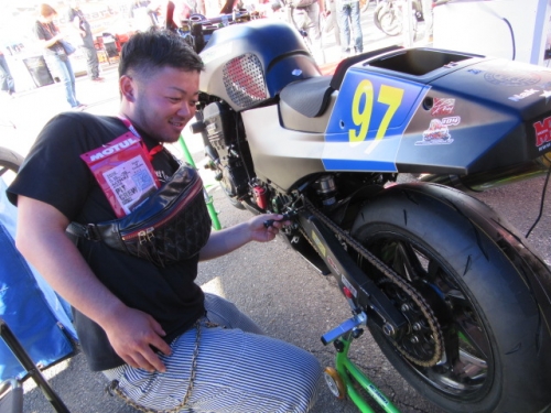 ![]() 無事フロッグ :ピンク3号2018-05-27 at 22:31PM by 店長快晴に恵まれた週末 各地でイベントやツーリングの声を聞きました^^ 気持ちいい季節に、楽しく乗るために 正しいメンテナンス、お勧めいたします^^ 明日から 7/22開催のDRAG&STYLE KASAOKA 200 DRAGのエントリー開始です。 ニンジャ乗りは勿論 スタート練習のロードライダーまで 奮って御参加下さい。一度経験すると 病みつきになりますよ^^ 画像は前後5センチダウン 初めてのニンジャレディー用参考画像です。 これぐらい下がってると、スタート 決まりそうでしょ(*^^)v テスト走行に出かけました。 3号のアッパーカウルは ウェンズデーカップで見た アシダ号に憧れてマジカルレーシングを選択^^ そのアシダさんから頂いた 豚まんがヤングに大ヒット^^ 待ちに待った愛車のテストに 余念が有りませんが・・・・ ヤングの小腹はキッチリ満たされました^^ 美味しかった~!(^^)! 男気ジャンケン。 これぐらいの人数だと 軽く危険な領域に(^_^;) 5月のピットクルー 11月もきっとクルーな デーブ松本改め、TE●GA松本が勝利しました。 愛好家らしい サマーシールドですね^^ 奥様、彼女達の 免許取得が流行してます。 きっと、バイクで夜な夜な消えていく ダーリンばっかバイクに、触発されたんでしょうね^^ カフェライダーめざして 頑張って取得されて下さい。何とか製作します^^ こんな置き土産が、置いてあります^^ たばこの包み紙かな? 器用に男性も捕まえてクダサイね!(^^)! 応援してますよ 他のライダーに比べ ビビリミッターが効いてるので 全然飛び込めていません(>_<)お恥ずかしい・・・・ しか~し 業務はガンガン追い込んで行きますよ~^^ お待たせしているお客様の 笑顔をガソリンに フルスロットルで製作して参ります(^^ゞ 今週も、宜しくお願い致します<m(__)m> テイスト参戦記3 まとめ2018-05-21 at 14:53PM by 店長とうとう当日 モンスタークラスに出場している 大山さんがクルーに徹してくれて ホントに心強かったm(__)m 慣れないサーキットは 施設の場所さえ不安要素 きめ細かいサポート、私も見習います。 ホントに有り難うございました<m(__)m> Z900RSデモ車に跨り 大福顔のデーブ松本くん。宿隣接の ドンキホーテにTEN●Aを買いに行ったのは 内緒にしときますね^^ 1週目の1ヘアでは アシダさんにミサイルになりかけ オタオタが直りません。気を取り直そうと ピットインするも もう時間切れ(+o+) 昨日のタイムが出ない・・・・(^_^;) クルーしてくれてるみんなや、応援して下さる方の為 そして弱気な自分に負けないために 一つでも順位上げなきゃと 自分にプレッシャーかけます(>_<) キカイダ―のサイドバイクも♡ オッサンの憧れですね^^ ニンジャと言えば ブルドッカータゴス 田子さん ヤングニンジャ挨拶周りの件は お願いしておきました。色々な話を^^ 聞いて見聞を広めたらいいと思います。 田子さんが優しく教えてくれますよ^^ YSSキャンギャルの松島さんとのショット♡ 視線はパイの彼方 後ろには現地 アジアの国から来た二人・・・・・!(^^)! 表彰台ねらえるチーム^^ 頑張ってくださいね~と思いながら・・・ 緊張MAXでしたが 自分なりにベストラップは更新して 怪我無く無事に終了しました。 6秒台には届かず(T_T) 7秒11の初筑波で幕を閉じました。 私が走るために協力戴いた 全ての皆様に 心からお礼を申し上げます<m(__)m> アシダサンが 浪速の御老公様にDOGEZA^^ 完敗の御挨拶の様です(^_^;) もちろん私も御挨拶致しました。暫くかかると思いますが スタート先行で逃げ切りたいと思います。 後ろから詰めてくるガンマの音 蛭田社長の音は分かるんです^^ 私を含め、いい思い出になりましたね。 こんな感じで初めてのツクバ 無事終了致しました。 お世話になった K-FACTORY様 MAGICALRACING様 PMC様 SPEED TEC様 中川商会様 BRIDGESTONE様 MARVELOUSENGINEERING様 NakheysSpeed様 その他関係各社様 全てのMC・GEMMAのお客様に大変感謝しております。 秋のKAGURADUKI STAGEは 11月10.11日 私の出場するZERO1は11日です。 頑張って態勢整えて参戦したいと思いますので これからもMC・GEMMAを宜しくお願い致します。 本日より通常業務 頑張って行きますよ~(^^ゞ