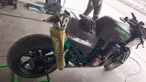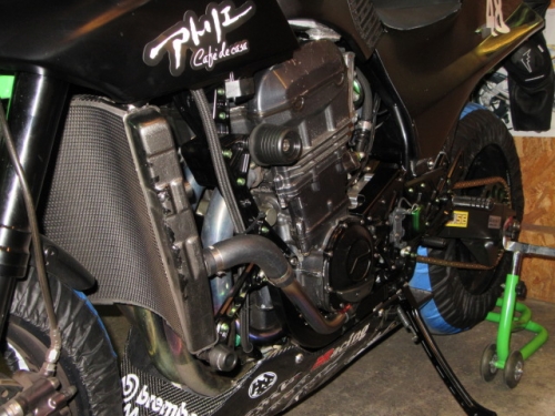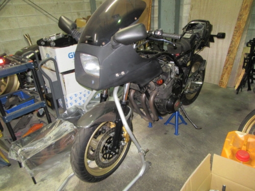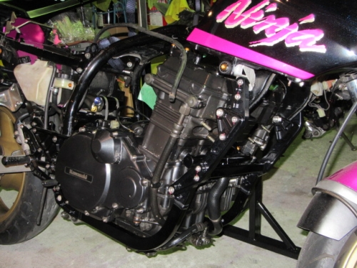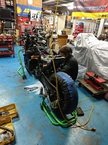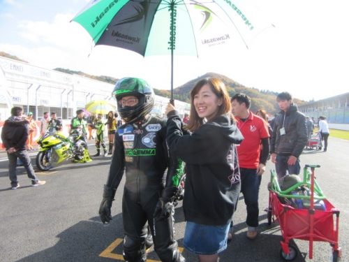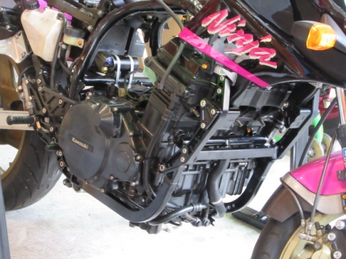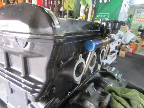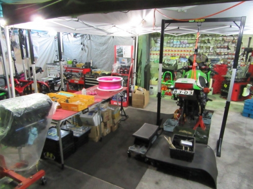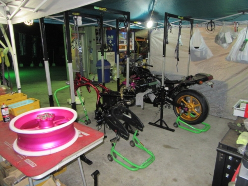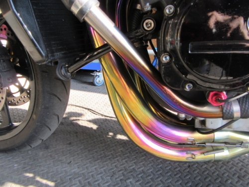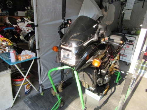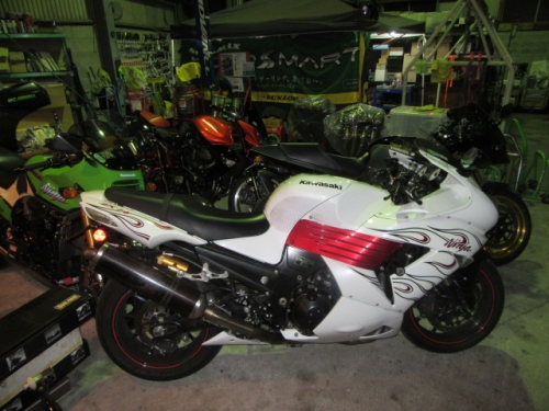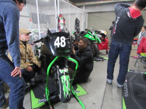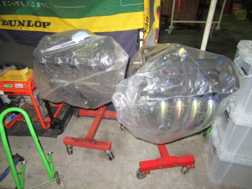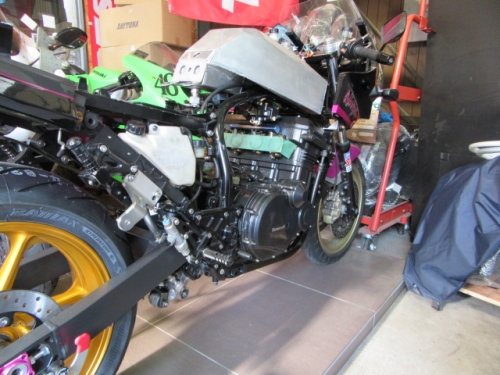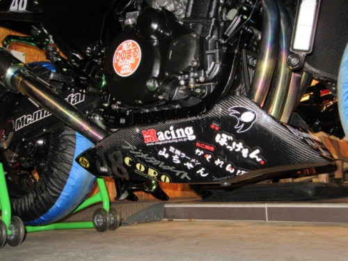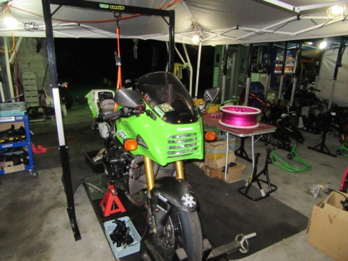 キッチリ確保出来ていますね^^同時に ファンスイッチ作動温度低下加工と ローテンプサーモに交換で 冷却系は万全です。ビッグラジエター装着車は 作動温度低下だけでもOKの実績有ります。 目張りが面倒なお客様は、こちらをご選択下さい(^_^) お客様に大変な支持を得ている ダウンチューブキットです。オプションボルトの連結で 弱いとされている腰回り(人間だと腰痛ですね^^) をコルセット巻いた時の様にしっかりさせます。 当店では、オフセット加工をする際には 工程名(Kファク合わせ^^)という手法で実施しています。 治具のダウンチューブとステッププレートを用いて 左右の耳をキッチリ固定 歪んでいるフレームは 、左右共切断してダウンチューブ及びステッププレートと 完全嵌合する状態で修正しております。 これで補強していないフレームでも エンジンパワーをがっちり受け止める事が、実証されています。 転倒が多いのですが(^_^;) エンジン換装作業時に、ひっぱたり、へっぱたりの ナイショノ作業(心当たりのある方、多いでしょ(*^_^*)は しなくても搭載できます。コケ太郎も実証実験の為なんですよ(>_<) (ホントは、怖がりなのでコケタクアリマセンガ^^) 6インチで合わせられる方も、増えてまいりました。 メリットデメリットは有りますが 太くてカッコいい^^ 単純な動機に、乗り易さを提供するのが 私たちの仕事だと思います。 ダウンチューブで補うと、ネガな部分はコストのみ^^ かなりのレベルのライダーですと 色々クレームも出ると思いますが ストリートでしたら、カッコ良くていいじゃん^^ですよ。 ノーマルエンジンでも、装着により しっかり感が感じられますよ^^ 首からのぶら下がりマウント。1100系からは ココが有りません。Kファクトリーさんは フロント補強ハンガーAキットを用いて、内外からサンドイッチ。 意地悪で、隙間をタイヤレバーで捏ねても!(^^)!揺れません。 柔軟性も特徴です。デモ車は しゃぼん玉さん取扱いの コーヨー製ラジエターキットに、4.5インチの 私みたいに可愛い、存在感の薄いオイルクーラーを 装着しています。こちらは、純正ラジエター用の マウントキットを用いて装着していますので 全てボルトオンです。こちら50代からの セパハンデビューがコンセプトの車両です。 フレームは前記のKファク合わせのみ。 決して速くはありませんが、おっさんのプライド位は 発揮できますよ^^興味のあるオッサンニンジャ(すみません(^^ゞ) ご試乗にいらしてください。 ピポットシャフトも人気のクロモリ製に換装して 腰痛撃退です^^ アクスルシャフト同様 可動部の根幹を支持する各シャフト類を チタンはびっくりオメメなので クロモリ無電解ニッケルメッキ製に交換すると 騙された気分で乗っても、効果が実感できるようです^^ 先日もツーリング帰りの、Fアクスルシャフトを KファクトリーさんのZRX用に交換したお客様が 大喜びでお立ち寄り。ブレーキも何も しっかりして安心やったよー^^と喜ばれてました。 エンジン換装時にはクロモリ製マウントボルトは勿論 各部シャフト類も合わせて、お求めください^^ エンジン上部マウント部分に 900R用のエンジンスライダーは装着していますが 先月のマイクナイトフライング(*^_^*)での 損傷は画像のとうりです。結構追い込まれていますので 意外と当たら無いようで^^立ちごけ気にされる方にも 安心です。イイことずくめの 骨格強化。ご自身もニンジャも 進めてみては如何でしょうか?体幹トレーニグは 詳しくありませんが、バイクの体幹性能アップは 当店まで、ご遠慮なくお申し付け下さい(^_^) 今週はバタバタしていますが 手はすぐ止まりますので、お立ち寄りください!(^^)! モトレボ参戦記2017-11-12 at 23:46PM by 店長ライダー11/12日と岡山国際サーキットで開催される モトレボリューションRd7最終戦に 参戦して参りました。色々テストしたい事が 山積みなうえ、マイクナイトコーナーでの フライング(*^_^*)も重なりスケジュールはタイトロープ^^ 1200系エンジンを欲張って積んでみたくなり 搭載するも始動不能(+o+) 1100ノーマルエンジンを搭載する レーシング回路を作成し、増幅等の回路が一切省かれているため セルを回すと点火出来ないんです(>_<) こりゃいかん(*_*)と 急遽1100エンジンに戻し、完成したのが11日朝8時でした(^_^;) なんとか、午後に慣熟走行をこなして一安心^^ 若手のお客様隊がお手伝いしてくれて 準備完了と相成りました。 関係各社及びお客様の参戦応援、大変感謝しておりますm(__)m 恒例のBBQです。会を追う毎に 段々、段取り良く進んでます。今回は女子ライダーカナポンチ^^と、 広島のともちゃん(ZX6乗ります)のお手伝いで 大変円滑に準備が進んでいました^^ 有り難うございますm(__)m 来年もご協力いただける 女性ライダーやファン^^の皆様 大大大募集中♡ お腹を空かした、オオカミ少年や諦めの悪い老狼(^^ゞの為に 来年も宜しくお願い致しますm(__)m 仕事が終わって、BBQだけ参加して下さっても結構ですよ